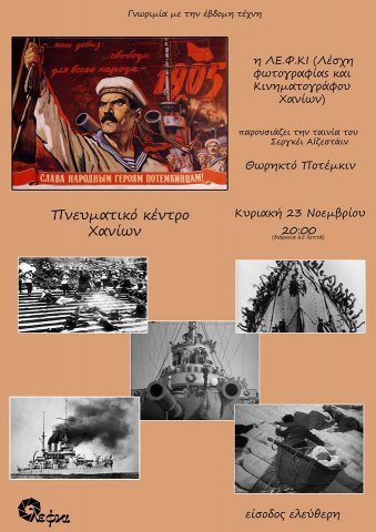 Ξεκινάμε τη Κυριακή 23 Νοεμβρίου στις 8.00 το βράδυ με τη προβολή της ταινίας του Σεργκέι Αϊζενστάιν "Θωρηκτό Ποτέμκιν" ταινία-σταθμό του παγκόσμιου κινηματογράφου.