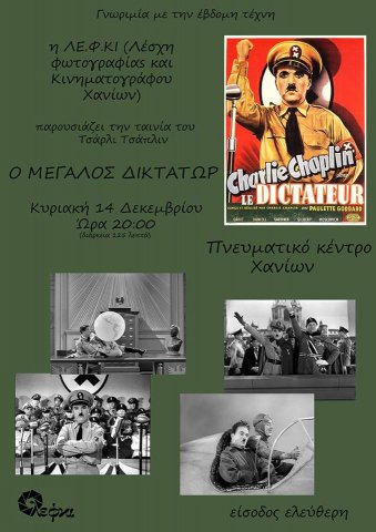 Τη Κυριακή 14 Δεκεμβρίου στις 8.00 μ.μ στο Πνευματικό Κέντρο η ΛΕ.Φ.ΚΙ. δίνει το κινηματογραφικό της ραντεβού με τη ταινία "Ο ΜΕΓΑΛΟΣ ΔΙΚΤΑΤΩΡ" του ΤΣΑΡΛΙ ΤΣΑΠΛΙΝ.