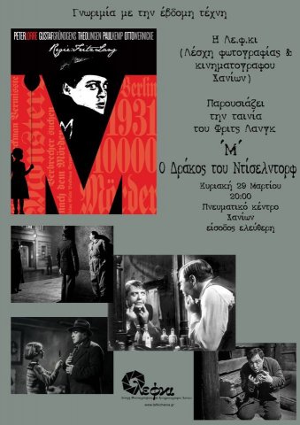 H Λέσχη Φωτογραφίας και Κινηματογράφου Χανίων προβάλει την Κυριακή 29 Μαρτίου στις 8.00 το βράδυ στο Πνευματικό Kέντρο Χανίων τη ταινία του Φριτς Λανγκ «Μ, Ο Δράκος του Ντίσελντορφ».