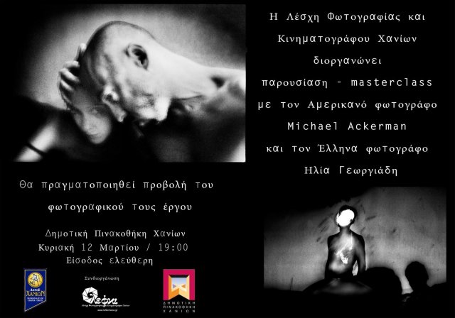Η Λέσχη Φωτογραφίας και Κινηματογράφου Χανίων σε συνεργασία με την Δημοτική Πινακοθήκη Χανίων διοργανώνει ανοιχτό masterclass την Κυριακή 12 Μαρτίου και ώρα 19:00, με τον Αμερικανό φωτογράφο Michael Ackerman και τον Έλληνα φωτογράφο Ηλία Γεωργιάδη.