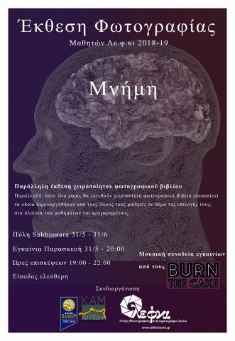 Η Λέσχη Φωτογραφίας και Κινηματογράφου Χανίων διοργανώνει έκθεση φωτογραφίας των αρχαρίων μαθητών της, της περιόδου 2018-2019, με θέμα "Μνήμη" και παράλληλη έκθεση χειροποίητου φωτογραφικού βιβλίου από τα μέλη της.