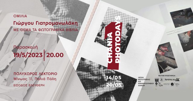 Η Λέσχη Φωτογραφίας και Κινηματογράφου Χανίων, με την υποστήριξη του Δήμου Χανίων και της ΚΕΠΠΕΔΗΧ ΚΑΜ, διοργανώνει το πρώτο Chania Photodays από τις 14 έως τις 20 Μαΐου 2023. Στα πλαίσια αυτής της εβδομάδας δράσεων για την φωτογραφία και την θέση της στο φωτογραφικό βιβλίο, ο Γιώργος Γιατρομανωλάκης θα μιλήσει για τα φωτογραφικά βιβλία.
