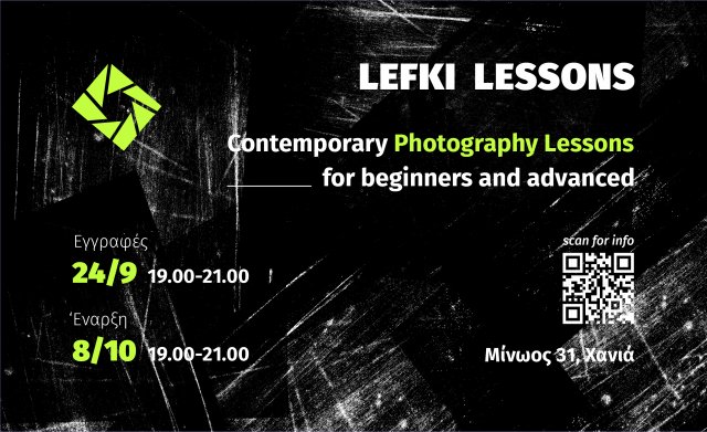 Η Λέσχη Φωτογραφίας και Κινηματογράφου Χανίων διοργανώνει μαθήματα αρχαρίων που θα ξεκινήσουν την Τετάρτη 8 Οκτωβρίου, θα είναι διαρκείας οκτώ μηνών και θα πραγματοποιούνται κάθε Τετάρτη 19:00-21:00 στον Πολυχώρο Λεκτόριο (Μίνωος αρ. 31).