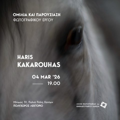 Η Λέσχη Φωτογραφίας και Κινηματογράφου Χανίων, φιλοξενεί τον Χάρη Κακαρούχα, την Τετάρτη 4 Μαρτίου, στις 19.00, στον Πολυχώρο Λεκτόριο.