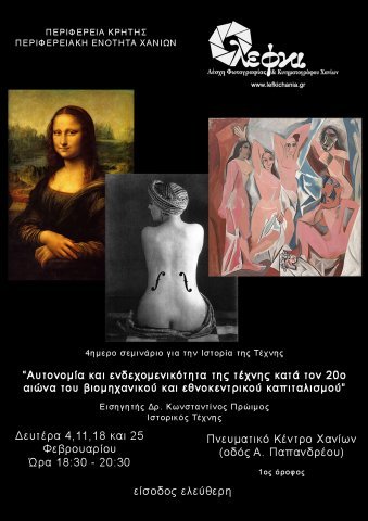 H Περιφέρεια Κρήτης - Περιφερειακή Ενότητα Χανίων και η Λέσχη Φωτογραφίας και Κινηματογράφου Χανίων στη σειρά των δράσεων με σκοπό την διάδοση, την μάθηση και την επαφή του κοινού της πόλης μας τόσο με την τέχνη της Φωτογραφίας όσο και με τις Εικαστικές Τέχνες γενικότερα, οργανώνουν στο πλαίσιο της Ιστορίας της Τέχνης, 4 (τέσσερα) δίωρα σεμινάρια με θέμα: «Αυτονομία και ενδεχομενικότητα της τέχνης κατά τον 20ο αιώνα του βιομηχανικού και εθνοκεντρικού καπιταλισμού» με εισηγητή τον ιστορικό τέχνης Δρ. Κωνσταντίνο Πρώιμο.