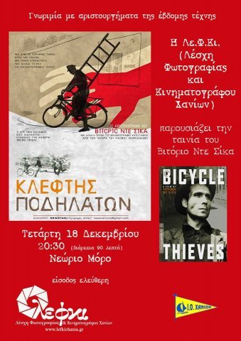 Η Λέσχη Φωτογραφίας και Κινηματογράφου Χανίων συνεχίζει το κινηματογραφικό ταξίδι της, την Τετάρτη 18 Δεκεμβρίου και ώρα 8.30μ.μ στο Νεώριο Μόρο, με τη ταινία "Κλέφτης ποδηλάτων".