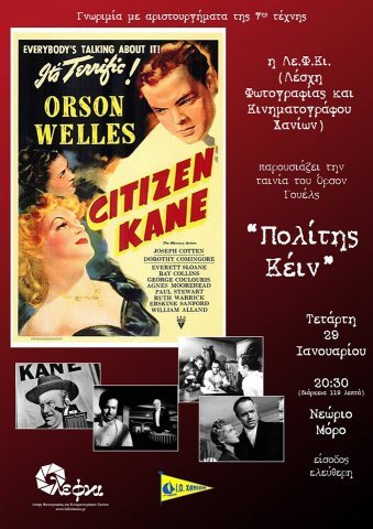 Η Λέσχη Φωτογραφίας και κινηματογράφου προβάλει τη ταινία του Όρσον Ουέλς, Πολίτης Κέιν. Η ταινία είναι γυρισμένη στην Αμερική το 1941. Για τον Πολίτη Κέιν έχουν γραφτεί σχεδόν όλων των ειδών οι αναλύσεις, αισθητικές, αφηγηματικές, τεχνικές, ιστορικές. και φυσικά πολλές πολλές κριτικές. Πολυεπίπεδη ταινία, με αισθητικές και τεχνικές καινοτομίες, σαφή πολιτική και κοινωνική θέση και άψογη ίντριγκα. Ίσως είναι η πρώτη φορά που βρίσκονται συγκεντρωμένα σε μια ταινία, τόσα πολλά και τόσο σοφά οργανωμένα, αλληλένδετα στοιχεία φόρμας και περιεχομένου. Η ιστορία είναι γνωστή, ο μεγιστάνας του Τύπου, ο Τσαρλς Φόρεστ Κέιν, ένας από τους πλουσιότερους ανθρώπους του κόσμου, πεθαίνει ολομόναχος μέσα στον απέραντο πύργο του, ψιθυρίζοντας τη λέξη «Ρόουζμπαντ». Ένας δημοσιογράφος, αρχίζει την έρευνα αναζητώντας την έννοια της λέξης, πιστεύοντας ότι τα τελευταία λόγια ενός ανθρώπου περικλείουν ολόκληρη τη ζωή του. Μέσα από τις μαρτυρίες , που φυσικά είναι υποκειμενικές, μαθαίνουμε την ιστορία της ζωής του και ταυτόχρονα γινόμαστε μάρτυρες της ανόδου και της πτώσης ενός άντρα όπου η δίψα για εξουσία, η αλαζονεία, το εξωτερικό μεγαλείο η εσωτερική πτώση, η μοναξιά και εν τέλει η τραγικότητα της ύπαρξης, κινηματογραφούνται σαν ένας δαιδαλώδης λαβύρινθος, όπου ο μίτος της Αριάδνης ακούει στο μυστηριώδες όνομα Rosebud. Η Ιστορία αφορά τη ζωή ενός πραγματικού μεγιστάνα των ΜΜΕ, ο οποίος συνέβαλε αρνητικά όχι μόνο στην προβολή της ταινίας αλλά και στην μετέπειτα επαγγελματική καριέρα του Όρσον Ουέλς. Ο πολίτης Κέην φιγουράρει πρώτο στις περισσότερες λίστες των καλύτερων ταινιών όλων των εποχών. Ένα έργο που αξίζει να το δει κανείς πολλές φορές , απολαμβάνοντας την κινηματογραφική τέχνη στο απόγειο της.